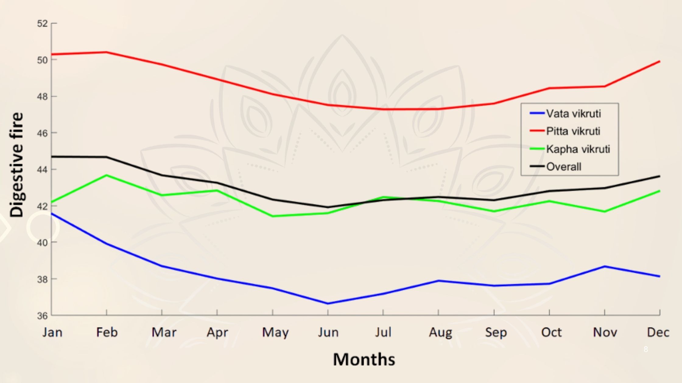 In our observational study done in the year 2018-2019 of 25,437 individuals using Nadi Tarangini, Nadi pariksha platform, digestive fire was consistently higher during winter months. Jatharagni showed a declining trend with the onset of summer and remained low throughout the monsoon. When correlated with Hindu Rutu, values were highest during Hemant and Shishir Rutu and lowest during Greeshma and Varsha Rutu. Moderate levels were observed during Vasant and Sharad Rutu.Classical texts note that Jatharagni is weakest during Greeshma and Varsha Rutu. Chaturmas, traditionally observed during the monsoon, emphasizes Laghu Aahar, acknowledging the natural state of Agnimandya during this period. This guidance remains highly relevant in modern preventive healthcare.