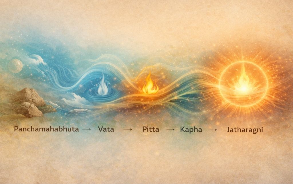 Ayurveda explains that every entity in the universe is formed by the Panchamahabhuta—Prithvi (earth), Aap (water), Tejas (fire), Vayu (air), and Akash (ether). The human body, being Panchabhautik, expresses these elements through the functional principles of Vata, Pitta, and Kapha. These Tridoshas govern all physiological, metabolic, and psychological processes and continuously respond to age, season, geography, diet, and lifestyle.