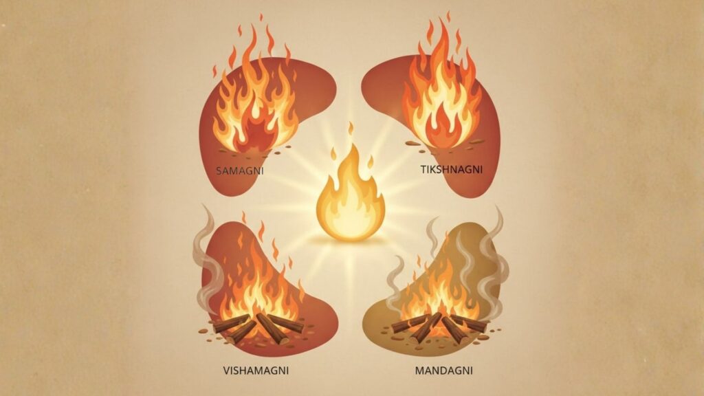 Agni also varies according to Prakriti. Kapha Prakriti individuals generally show Mandagni with slow digestion. Pitta Prakriti individuals show Tikshnagni with sharp and fast digestion. Vata Prakriti individuals show Vishamagni with irregular appetite and digestion patterns.