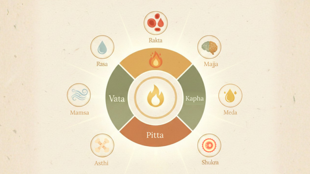 In Ayurveda, health is defined as *Samadosha, Samagni, Samadhatu and Mala Kriya with Prasanna Atma, Indriya and Mana*. Among these, Agni plays a central role. When Agni is balanced, it helps in maintaining proper balance of three Doshas – Vata, Pitta and Kapha. It also supports the nourishment and proper formation of Sapta Dhatus which are Rasa (Plasma), Rakta(blood), Mamsa (muscle), Meda (fat), Asthi (bones), Majja( bone marrow, brain) and Shukra (ovum, sperm). From the well nourished Dhatus, “Ojas” is formed which is considered the essence of immunity, vitality and strength of the body.